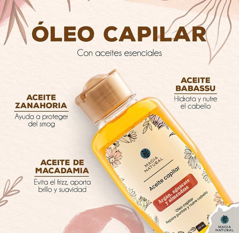 El Aceite Óleo Capilar, ha sido especialmente elaborado con aceites de productos naturales, como: aceite de argán, aguacate, coco, babasú, jojoba, macadamia y es enriquecido con vitamina E. Se encarga de nutrir los folículos capilares y promover el crecimiento, además proporciona brillo y suavidad al cabello, dejándolo hidratado, ayudando a combatir el frizz.
