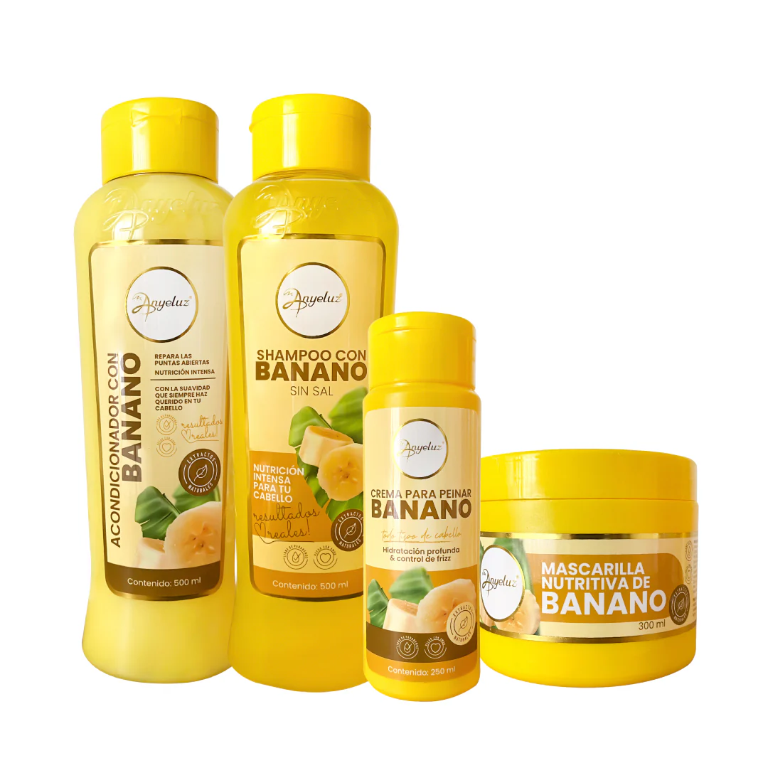 • Shampoo de Banano (500ml): con una fórmula enriquecida con Vitaminas A, C y D, extracto de banano, biotina y keratina, que fortalece, nutre y revitaliza el cabello frágil. Deja tu pelo suave, manejable y con un brillo espectacular, mientras combate el quiebre y proporciona hidratación profunda.